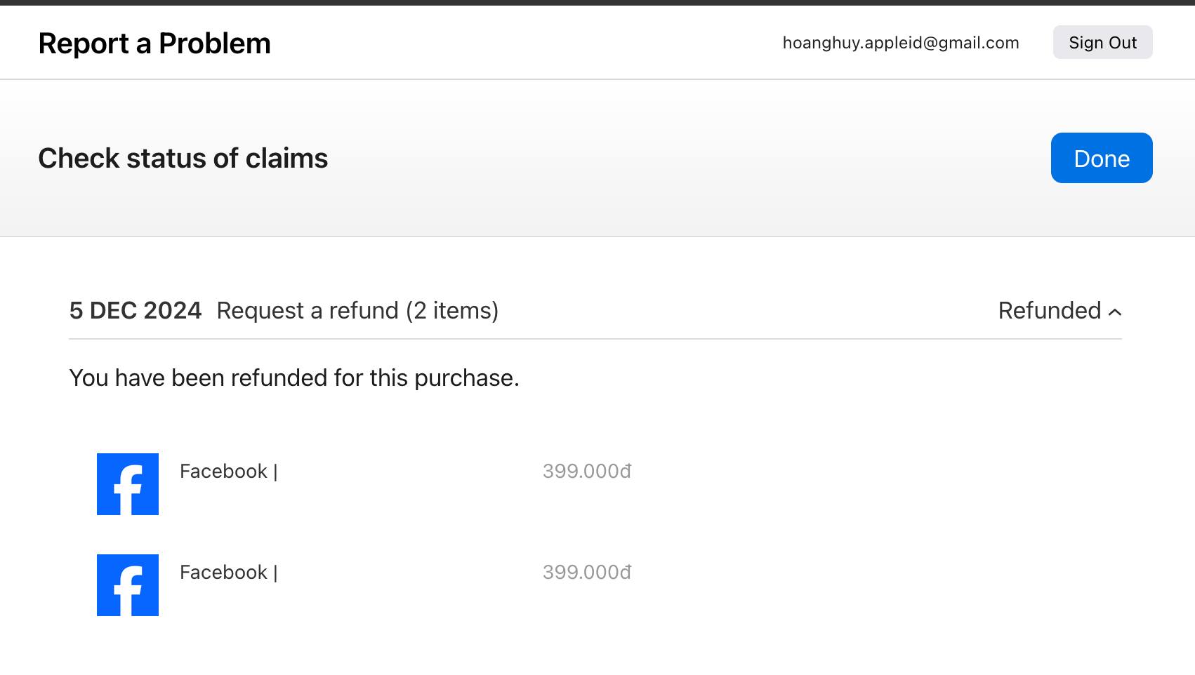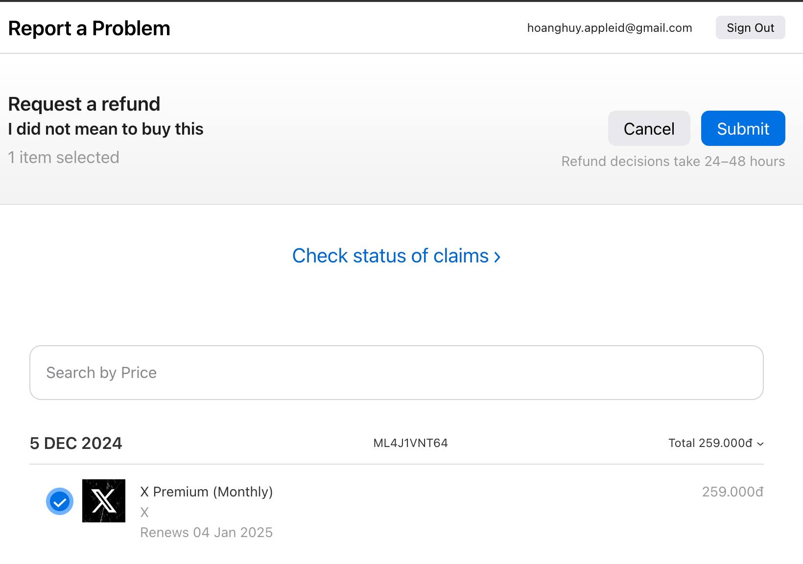 Bạn có thể vào https://reportaproblem.apple.com/status để kiểm tra trạng thái của yêu cầu, như trường hợp của mình thì tầm 24h là tiền được trả về tài khoản.